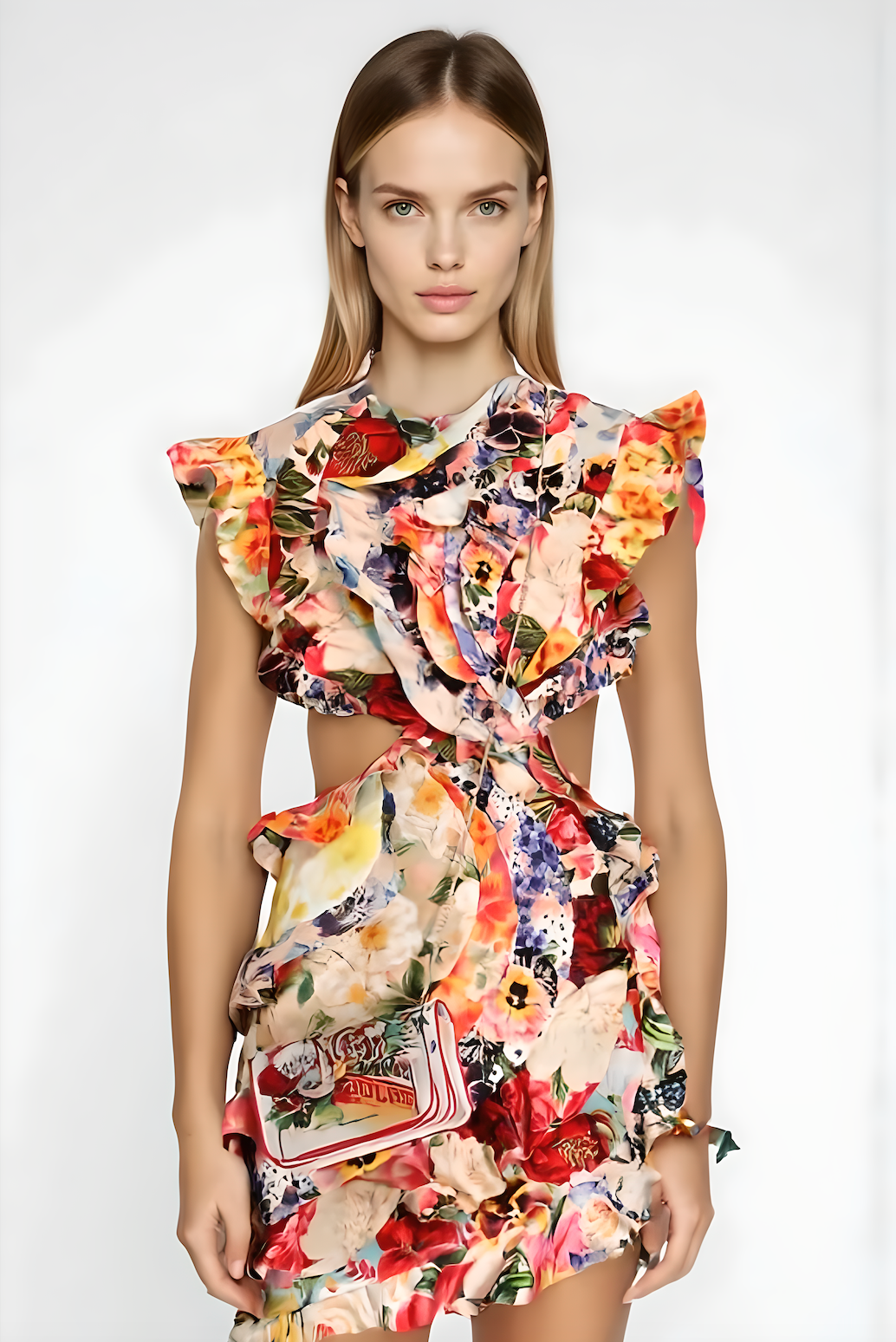 The Mon Cheri Ribbon Mini Dress features a fitted mini silhouette with cut-out shoulders and elastic black sleeves. A dramatic oversized black ribbon accents the bodice, adding bold contrast to the clean hourglass shape.